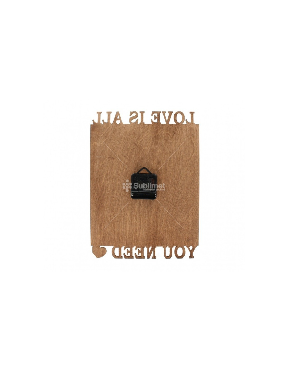Relojes love de madera personalizables con foto. Reloj rectangular fabricado en madera con texto "Love is all you need". Parte central circular personalizable. Incluye el mecanismo y las agujas.